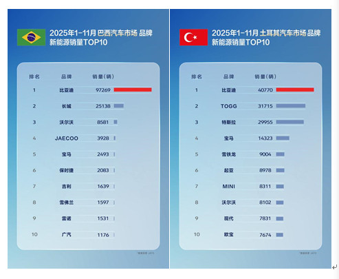 11月,比亚迪在巴西、土耳其、意大利、西班牙、匈牙利、克罗地亚等国拿下了新能源汽车销量第一,在新加坡等国家获得全品牌销冠。1-11月累计表现同样不俗,在巴西、土耳其、西班牙、意大利等国,比亚迪位列新能源汽车品牌销量榜首;在新加坡、中国香港等地区市场荣膺全品牌销量第一,备受消费者认可。